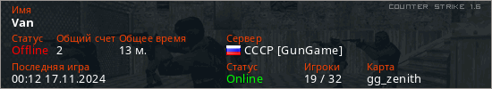 Играет на Counter Strike 1.6 сервере. Страна: РоссияПервый раз замечен 12:06 18.01.2024