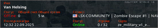 Играет на Counter Strike 1.6 сервере. Страна: СШАПервый раз замечен 12:30 22.09.2025