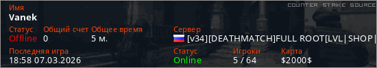 Играет на Counter Strike Source сервере. Страна: РоссияПервый раз замечен 18:37 07.03.2026