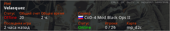 Играет на Call of Duty 4: Modern Warfare сервере. Страна: РоссияПервый раз замечен 19:59 18.12.2025