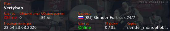 Играет на Team Fortress 2 сервере. Страна: РоссияПервый раз замечен 23:26 23.03.2026