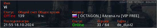 Играет на Counter Strike Source сервере. Страна: РоссияПервый раз замечен 14:58 13.03.2021