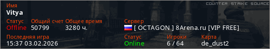 Играет на Counter Strike Source сервере. Страна: РоссияПервый раз замечен 21:09 13.01.2020