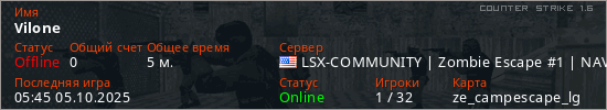 Играет на Counter Strike 1.6 сервере. Страна: СШАПервый раз замечен 05:43 05.10.2025