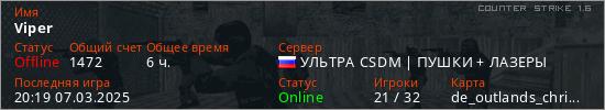 Играет на Counter Strike 1.6 сервере. Страна: РоссияПервый раз замечен 08:33 27.01.2025