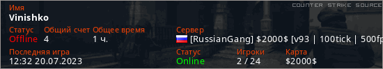 Играет на Counter Strike Source сервере. Страна: РоссияПервый раз замечен 17:18 26.04.2023