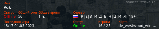 Играет на Counter Strike 1.6 сервере. Страна: РоссияПервый раз замечен 19:29 23.06.2022