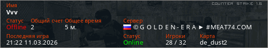 Играет на Counter Strike 1.6 сервере. Страна: РоссияПервый раз замечен 20:58 11.03.2026