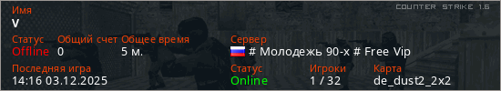 Играет на Counter Strike 1.6 сервере. Страна: РоссияПервый раз замечен 14:14 03.12.2025
