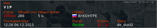 Играет на Counter Strike 1.6 сервере. Страна: РоссияПервый раз замечен 02:22 18.02.2020