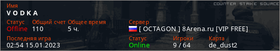 Играет на Counter Strike Source сервере. Страна: РоссияПервый раз замечен 21:22 13.04.2021