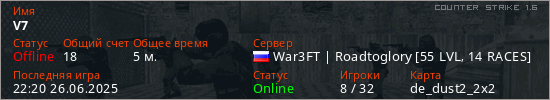 Играет на Counter Strike 1.6 сервере. Страна: РоссияПервый раз замечен 22:16 26.06.2025