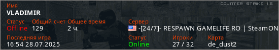 Последний раз был в сети 16:54 28.07.2025 Игрок с таким ником замечен на 17 серверах