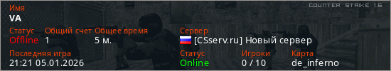 Играет на Counter Strike 1.6 сервере. Страна: РоссияПервый раз замечен 21:13 05.01.2026