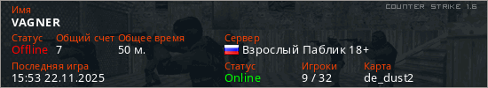 Играет на Counter Strike 1.6 сервере. Страна: РоссияПервый раз замечен 12:42 14.06.2022