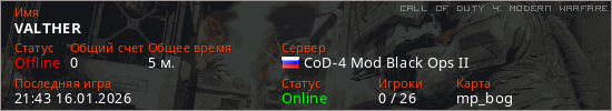 Играет на Call of Duty 4: Modern Warfare сервере. Страна: РоссияПервый раз замечен 21:23 16.01.2026