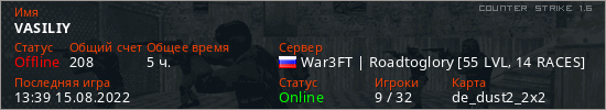 Играет на Counter Strike 1.6 сервере. Страна: РоссияПервый раз замечен 11:02 28.07.2022