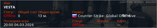 Играет на Counter Strike Source сервере. Страна: РоссияПервый раз замечен 19:39 06.03.2026
