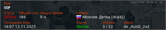 Играет на Counter Strike 1.6 сервере. Страна: РоссияПервый раз замечен 08:56 28.09.2021