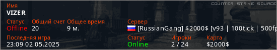 Играет на Counter Strike Source сервере. Страна: РоссияПервый раз замечен 22:37 02.05.2025