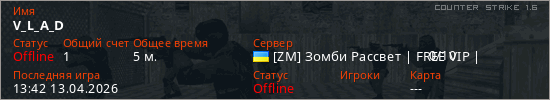 Играет на Counter Strike 1.6 сервере. Страна: УкраинаПервый раз замечен 13:34 13.04.2026