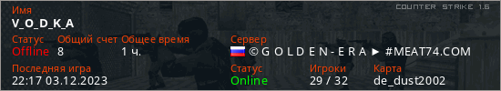 Играет на Counter Strike 1.6 сервере. Страна: РоссияПервый раз замечен 15:19 12.11.2023