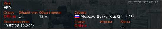Играет на Counter Strike 1.6 сервере. Страна: РоссияПервый раз замечен 22:04 01.10.2024