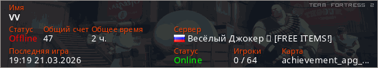 Играет на Team Fortress 2 сервере. Страна: РоссияПервый раз замечен 20:20 08.03.2026