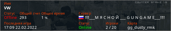 Играет на Counter Strike 1.6 сервере. Страна: РоссияПервый раз замечен 17:17 21.02.2022