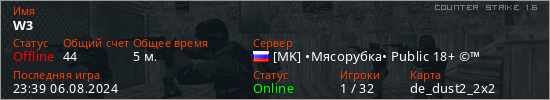 Играет на Counter Strike 1.6 сервере. Страна: РоссияПервый раз замечен 23:11 06.08.2024