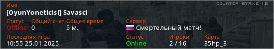 Играет на Counter Strike 1.6 сервере. Страна: РоссияПервый раз замечен 10:53 25.01.2025