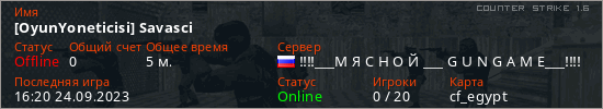 Играет на Counter Strike 1.6 сервере. Страна: РоссияПервый раз замечен 16:18 24.09.2023