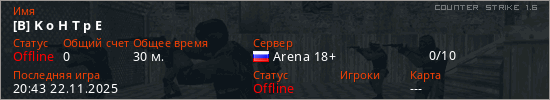 Играет на Counter Strike 1.6 сервере. Страна: РоссияПервый раз замечен 00:20 08.11.2025
