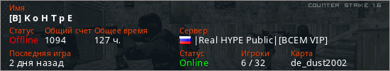 Играет на Counter Strike 1.6 сервере. Страна: РоссияПервый раз замечен 23:26 26.12.2023