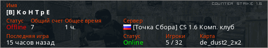 Играет на Counter Strike 1.6 сервере. Страна: РоссияПервый раз замечен 18:35 19.04.2026