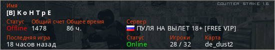 Играет на Counter Strike 1.6 сервере. Страна: РоссияПервый раз замечен 18:51 27.06.2025
