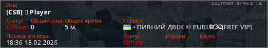 Играет на Counter Strike 1.6 сервере. Страна: УкраинаПервый раз замечен 18:21 18.02.2026