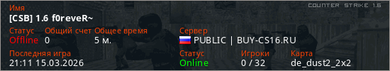 Играет на Counter Strike 1.6 сервере. Страна: РоссияПервый раз замечен 21:08 15.03.2026