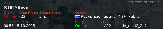 Играет на Counter Strike 1.6 сервере. Страна: РоссияПервый раз замечен 22:47 07.02.2023