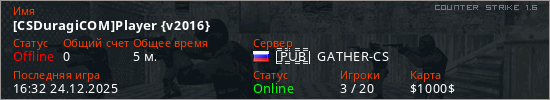 Играет на Counter Strike 1.6 сервере. Страна: РоссияПервый раз замечен 16:30 24.12.2025
