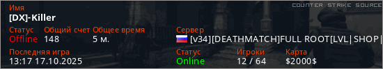 Играет на Counter Strike Source сервере. Страна: РоссияПервый раз замечен 13:13 17.10.2025
