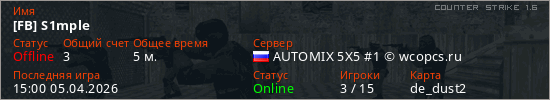 Играет на Counter Strike 1.6 сервере. Страна: РоссияПервый раз замечен 14:37 05.04.2026
