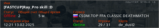 Играет на Counter Strike 1.6 сервере. Страна: РоссияПервый раз замечен 12:17 13.02.2025