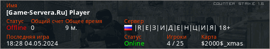 Играет на Counter Strike 1.6 сервере. Страна: РоссияПервый раз замечен 18:22 22.04.2024