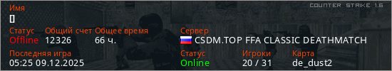 Играет на Counter Strike 1.6 сервере. Страна: РоссияПервый раз замечен 14:42 10.11.2019