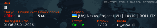 Играет на Counter Strike Global Offensive сервере. Страна: УкраинаПервый раз замечен 00:45 26.01.2026