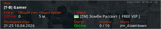 Играет на Counter Strike 1.6 сервере. Страна: УкраинаПервый раз замечен 21:21 10.04.2026