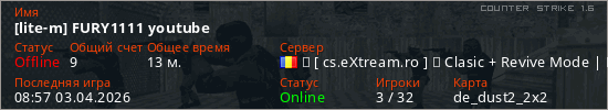 Играет на Counter Strike 1.6 сервере. Страна: РумынияПервый раз замечен 05:20 03.04.2026