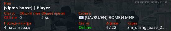 Играет на Counter Strike 1.6 сервере. Страна: ИзраильПервый раз замечен 11:10 21.04.2026