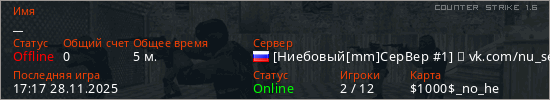Играет на Counter Strike 1.6 сервере. Страна: РоссияПервый раз замечен 17:06 28.11.2025